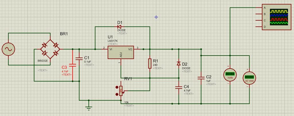 Details: The design was made using Proteus and tested on the computer before building the same in real life. I used a step-down transformer and a full bridge diode rectifier with a capacitor (2200 uF) filter to supply DC to IC LM317T. Adjustable output was then fed to the trimmer with help of wires. Through this, I came to know and design simple circuits using CAD (Computer-Aided Design) tools like Proteus and Orcad. The project was finally made and I got my trimmer working again.