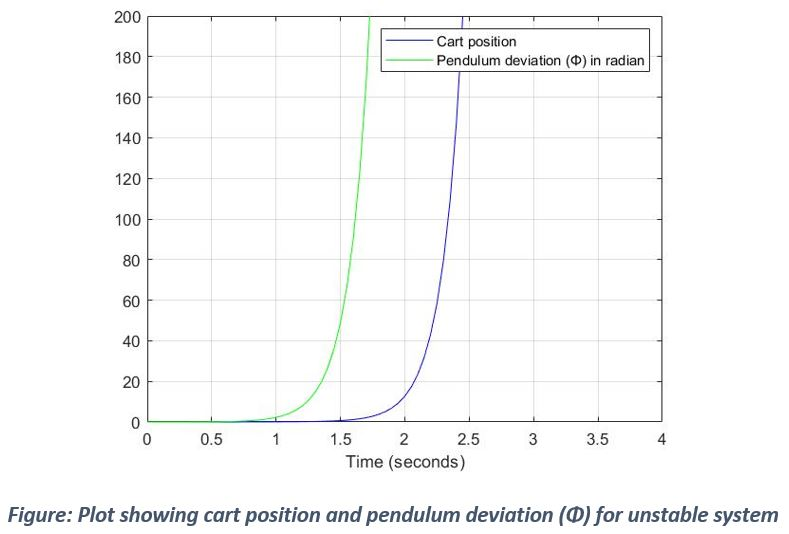 Unstable response: From the figure, it can be inferred that as cart moves, deviation of pendulum also increases to a reasonably high value which means that it is not held upright and falls down.