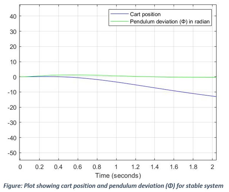Stable response: From the figure, it can be inferred that as cart moves, pendulum deviation (Φ) is very close to zero as expected. As a result, pendulum does not drops down and stays upright.